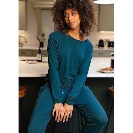 Experience the epitome of comfort and style with our luxurious teal slouch jersey pyjama set from the Maple collection. Crafted from a sumptuously soft blend of 95% modal and 5% elastane, the pyjama top ensures a heavenly feel against your skin. With its long raglan sleeves, this top offers a relaxed and laid-back silhouette, perfect for unwinding after a long day. The subtle self-fabric trim adds an elegant touch to the overall design, showcasing attention to detail. The beautiful light teal trimming adds a touch of elegance to the overall design. For convenience and flexibility, the pyjama bottoms feature an elasticated back, ensuring a perfect fit every time. The working drawstring at the front allows you to adjust the waistband to your desired level of snugness. Additionally, two side pockets provide practicality for keeping small essentials close at hand. To further enhance the comfort factor, these pyjama bottoms are finished with cuffs at the ankle that not only create a stylish look but also ensure a snug and cosy fit, keeping you comfortable throughout the night. Whether you're lounging around the house or drifting off to sleep, our slouch jersey pyjama set guarantees a delightful experience.
