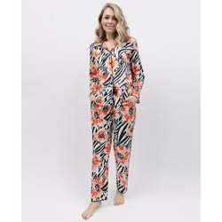 Indulge in the untamed elegance of our Nicole Black and White Animal Print Pyjama Set, where comfort meets wild style! This captivating set features a pyjama top and bottoms adorned with a captivating animal print pattern, beautifully embellished with vibrant red flowers. These blossoming accents add a touch of floral charm to the untamed jungle-inspired design, creating a harmonious blend of fierceness and femininity. The pyjama top is designed with long sleeves and the trimmings of charcoal modal add a touch of sophistication and safari flair. The revere collar and charcoal modal-covered buttons take the top from basic to wildly chic, ensuring you look fabulous even in your sleepwear. The shaped bottom hem adds a flattering silhouette, making this pyjama top as fashionable as it is comfortable. The pyjama bottoms in this set continue the wild theme and their elasticated back waist provides a comfortable and adjustable fit, while the relaxed flattering ankle split design allows for ease of movement. Both are crafted from a luxurious blend of 60% cotton and 40% modal and therefore offer a soft and breathable feel against your skin, guaranteeing a restful night's sleep.