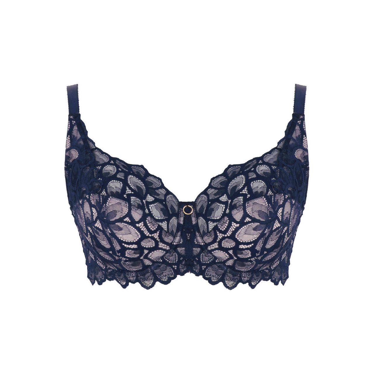 The Allure Full Cup bra is luxury lingerie at its finest! This enchanting bra is certain to give you uplifting support you can count on. Stretch floral lace paired with a sophisticated gold ring detailing are just some of the features that make this fuller bust friendly bra a must-have. The black version became an instant hit here in The Lady's Slip, and there is no doubt that the navy version will also hit all the high notes