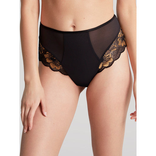 Panache Sabrina high-waist brief provides the perfect pairing for your Sabrina balcony bra. The opulent retro high-waist style, with stunning black and gold lace gives an incredible silhouette and the perfect form for under your clothes.